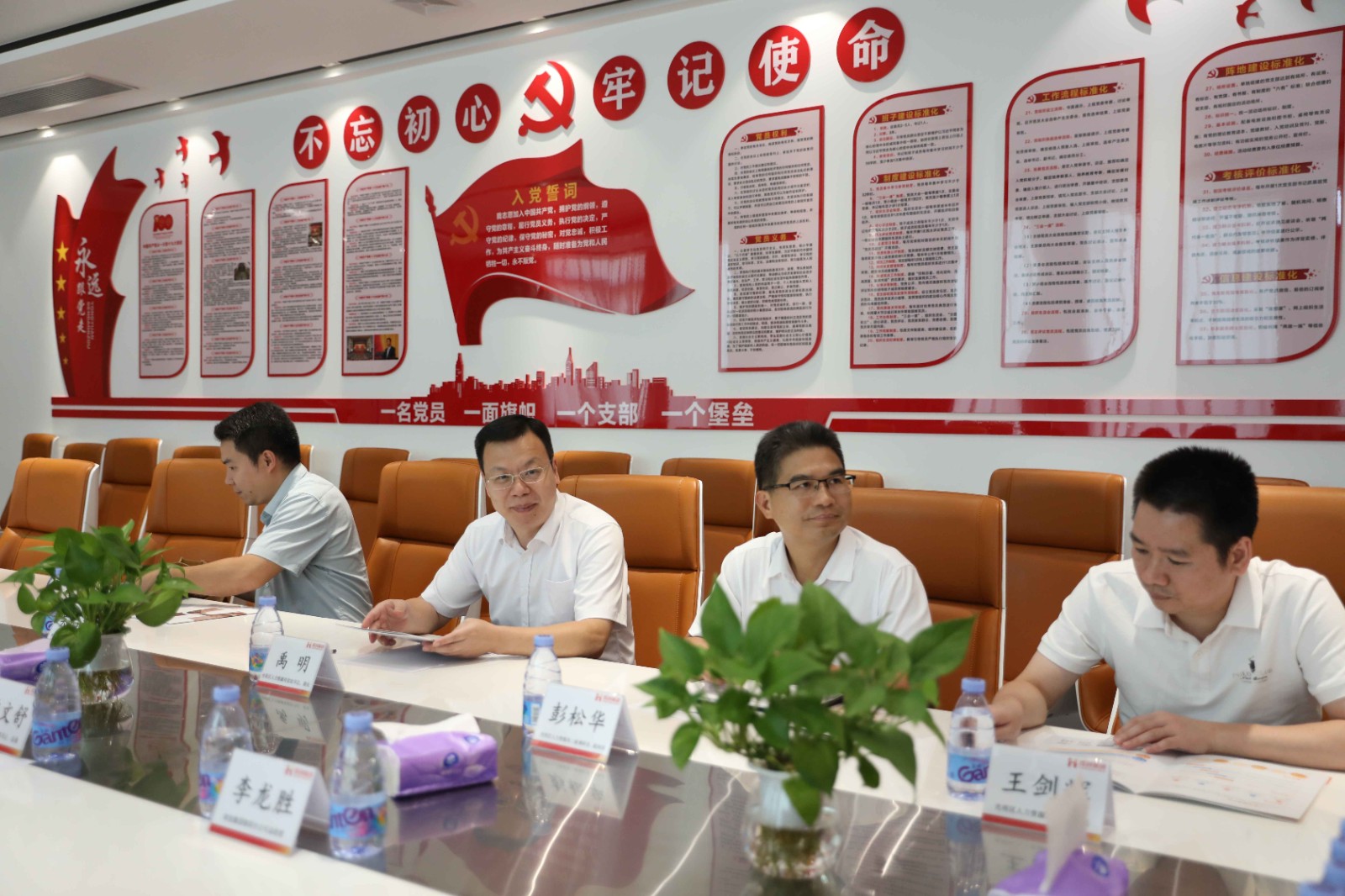 陈文舒、李龙胜等带领来宾参观了公司内部,介绍企业文化墙和欢创的发展历程。